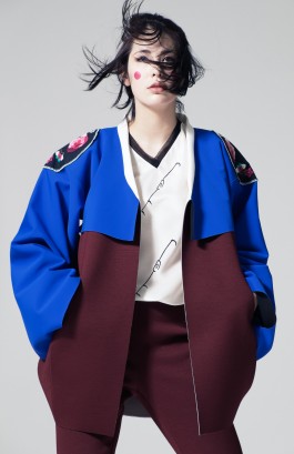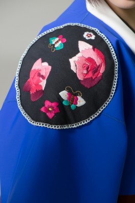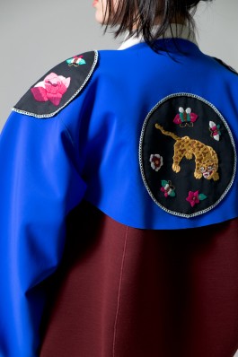 East-West, traditional-modern, Korean-German? Inspired by the own heritage and identity with a multi-ethnical background a two-piece was created, which combines elements of the korean national clothing, the Han Bok, and the varsity jacket as a western counterpart as well as traditional inspired hand-made embroideries and innovative materials at once.